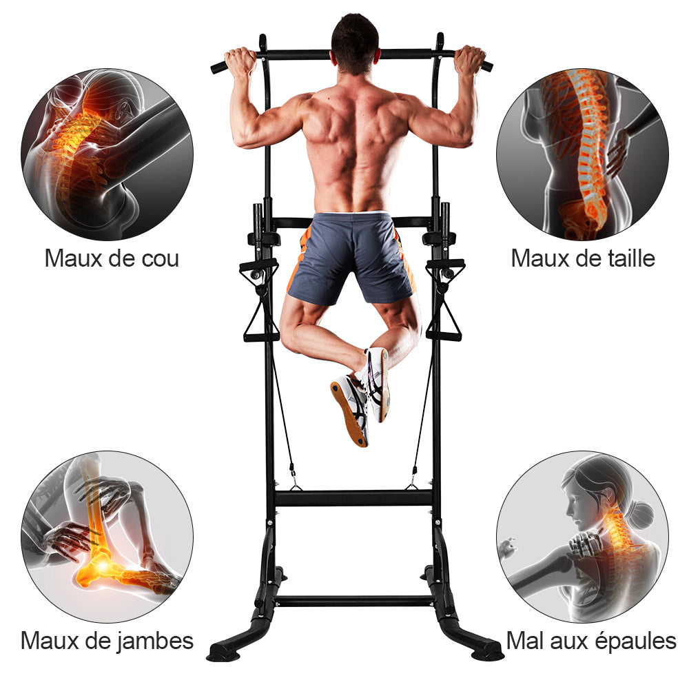 - Tour de Puissance D'entraînement Complet du Corps. Il s'agit d'une tour de puissance multifonctionnelle qui prend en charge les élévations verticales des genoux, les pompes, les dips ainsi que les tractions, qui aident à tonifier et à cibler vos bras, votre tronc, vos épaules, votre poitrine et votre dos pour un corps plus fort.